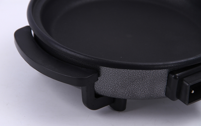 The electric skillet with a glass lid is flat-bottomed, and its body is made of die-cast aluminum, which ensures a uniform heating performance.